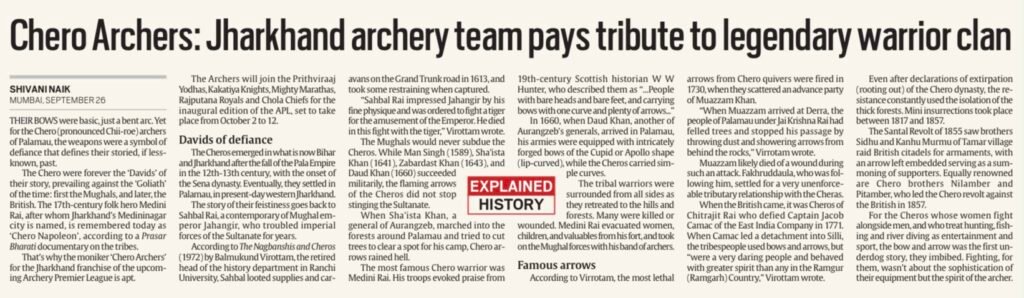 The contemporary setting is the launch of the new Archery Premier League (APL) and the naming of its Jharkhand-based franchise. This modern event, however, is deeply rooted in the historical setting of the Palamu region of Jharkhand. The name pays tribute to the Chero tribe, a once-powerful ruling clan renowned for their fierce independence and mastery of archery. The article highlights their long history of resistance, from famous rulers like Medini Rai who fought the Mughals, to the 19th-century heroes, brothers Nilamber and Pitamber, who led a major revolt against the British in 1857.