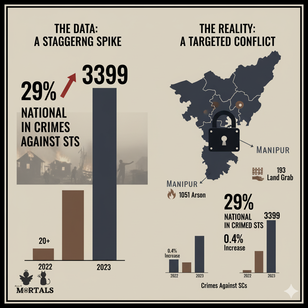 For over a year, harrowing stories of violence have emerged from the conflict-torn state of Manipur. But now, the dry, official statistics have arrived to tell the most chilling and undeniable story of all. The latest “Crime in India” report from the National Crime Records Bureau (NCRB) for the year 2023 has put a number to the tragedy. It reveals a staggering 29% nationwide jump in crimes against Scheduled Tribes, with one state, Manipur, standing as the devastating epicenter of this violence. This case study delves into what these official numbers truly mean, not as mere statistics, but as a grim, quantitative record of a targeted ethnic conflict.