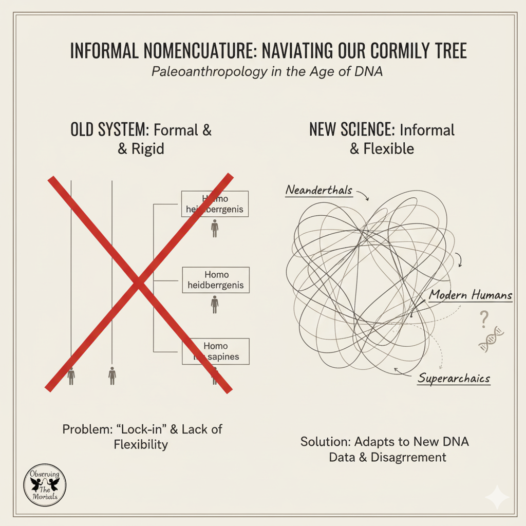 - The Power of Flexibility Over “Lock-In”: The central thesis is that scientists prefer informal names because they offer flexibility. A formal Linnaean species name (like Homo heidelbergensis) “locks in” a specific, permanent classification. In a field like paleoanthropology, where new discoveries constantly shift our understanding, this rigidity is a problem. Informal names allow researchers to talk about a group of fossils or a genetic population without having to commit to a formal, and often hotly debated, species designation.