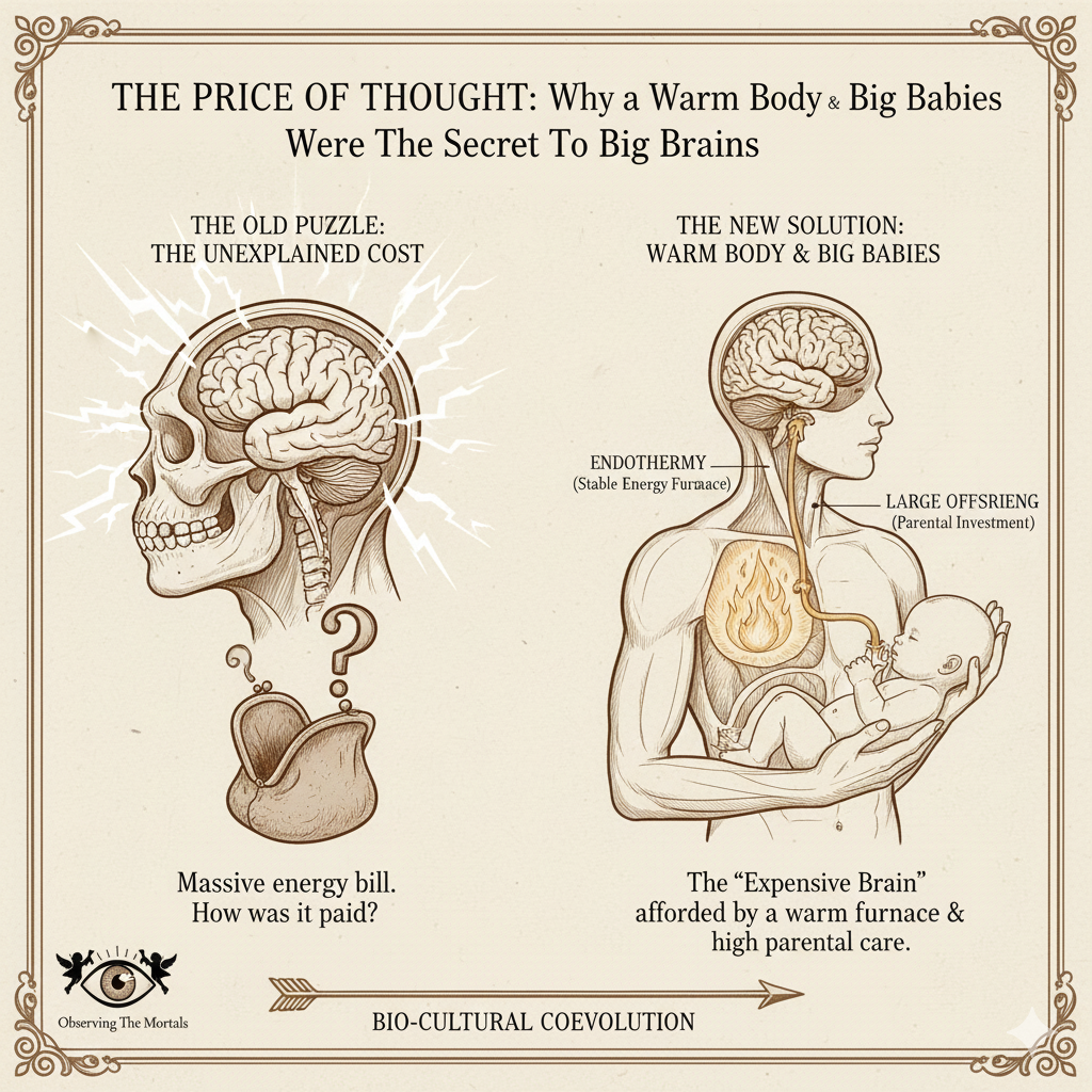 The human brain is an evolutionary masterpiece, but it comes at a staggering price. It is the most “expensive” organ in our body, consuming a massive amount of our daily energy. For decades, a central puzzle in anthropology has been how our ancestors managed to pay this bill, allowing for the evolution of our unique intelligence. A major new study provides a powerful, unifying answer. It wasn’t just about what we ate or how we socialized; it was about two fundamental biological preconditions: a warm body and big babies. This case study explores the “Expensive Brain Hypothesis” and the idea that being warm-blooded was the evolutionary key that unlocked the door to human consciousness.