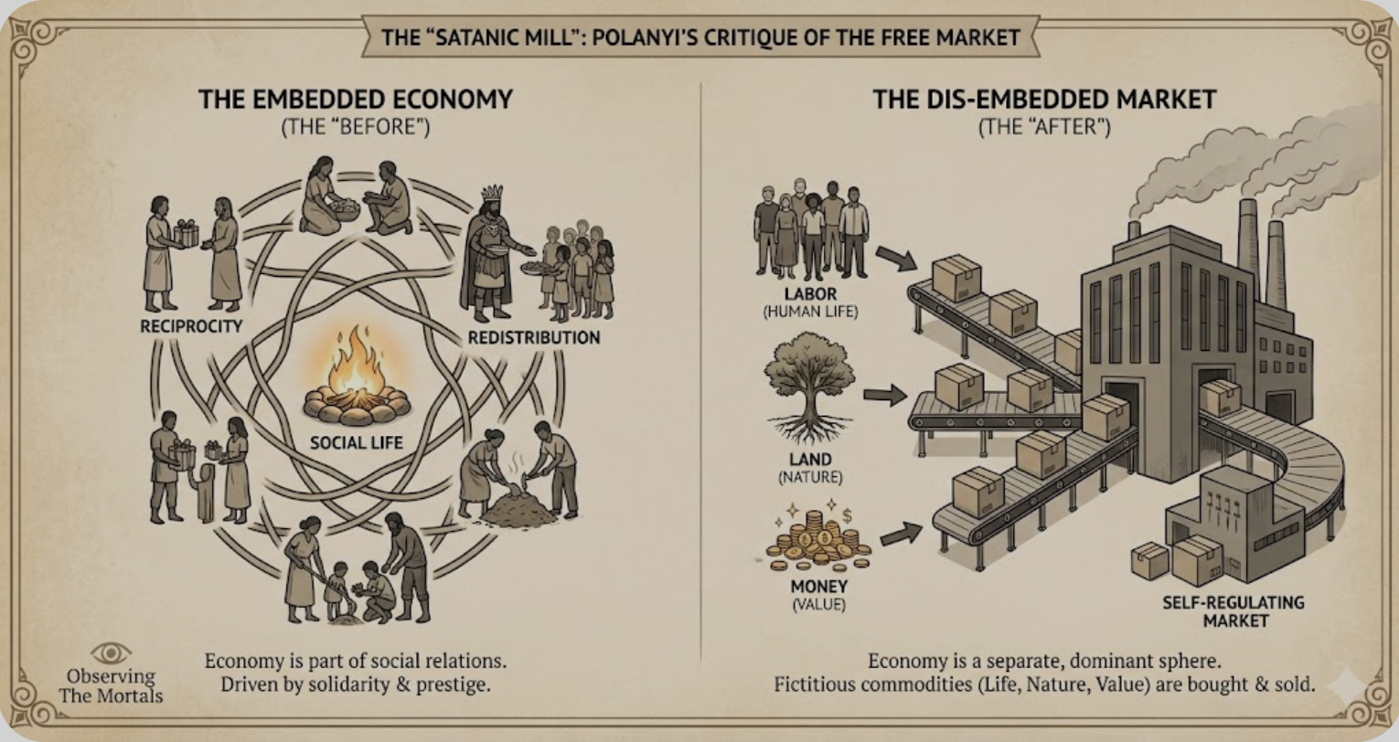 - The “Embedded” Economy (The “Before”): Polanyi’s first great insight was that in almost all pre-modern and non-Western societies, the economy is “embedded” within social and political relationships. It is not a separate, autonomous sphere. Exchange is driven by social principles like: